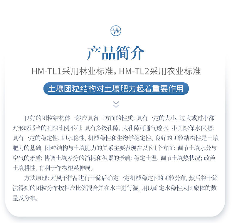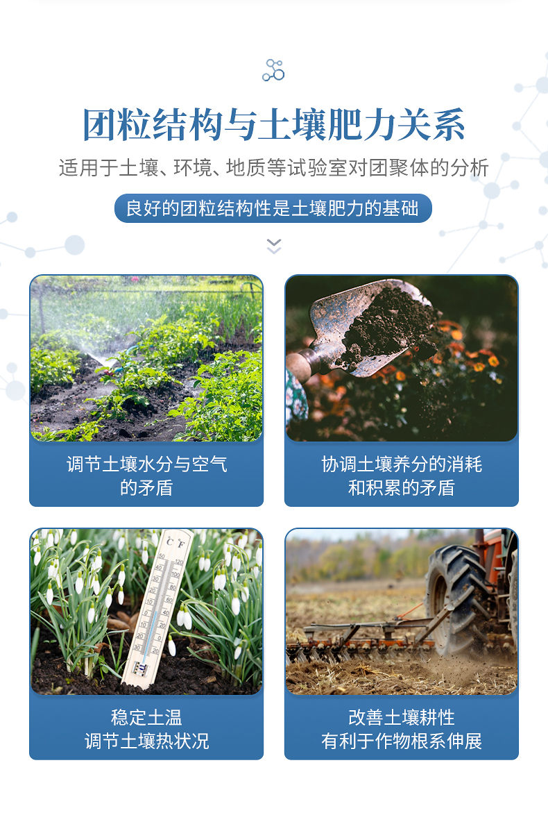 1、土壤團(tuán)粒結(jié)構(gòu)對(duì)土壤肥力起著重要作用。良好的團(tuán)粒結(jié)構(gòu)體一般應(yīng)具備三方面的性質(zhì):具有一定的大小,過(guò)大或過(guò)小都對(duì)形成適當(dāng)?shù)目紫侗壤焕?具有多級(jí)孔隙,大孔隙可通氣透水,小孔隙保水保肥;具有一定的穩(wěn)定性,即水穩(wěn)性、機(jī)械穩(wěn)性和生物學(xué)穩(wěn)定性。良好的團(tuán)粒結(jié)構(gòu)性是土壤肥力的基礎(chǔ),團(tuán)粒結(jié)構(gòu)與土壤肥力的關(guān)系主要表現(xiàn)在以下幾個(gè)方面:調(diào)節(jié)土壤水分與空氣的矛盾;協(xié)調(diào)土壤養(yǎng)分的消耗和積累的矛盾;穩(wěn)定土溫,調(diào)節(jié)土壤熱狀況;改善土壤耕性,有利于作物根系伸展。土壤團(tuán)粒分析儀適用于土壤、環(huán)境、地質(zhì)等試驗(yàn)室對(duì)團(tuán)聚體的分析。